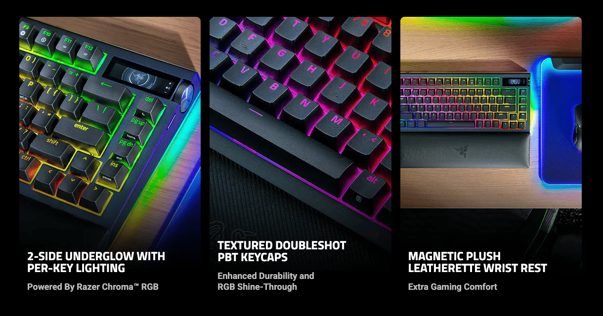 El BlackWidow V4 Pro 75% no solo destaca en rendimiento, sino también en diseño. La iluminación Razer Chroma™ RGB, con retroiluminación individual por tecla y brillo inferior de dos lados, permite configuraciones visuales impresionantes. Además, las keycaps Doubleshot PBT texturizadas ofrecen una durabilidad excepcional y un acabado premium.