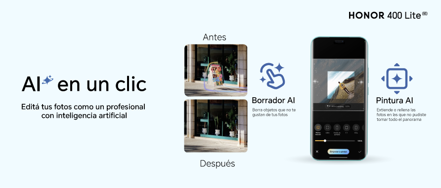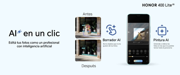 El HONOR 400 Lite incorpora un botón de cámara IA, una función exclusiva que permite capturar momentos de manera instantánea con un solo toque. Esta herramienta no solo facilita la fotografía espontánea, sino que también actúa como un atajo directo a la creatividad, integrándose con funciones como la Pintura con IA, que expande imágenes con elementos generados por inteligencia artificial.